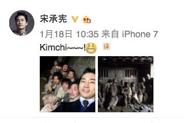 1月18日,演員宋承憲在微博發布一組照片,並附文道:「Kimchi~~~!」