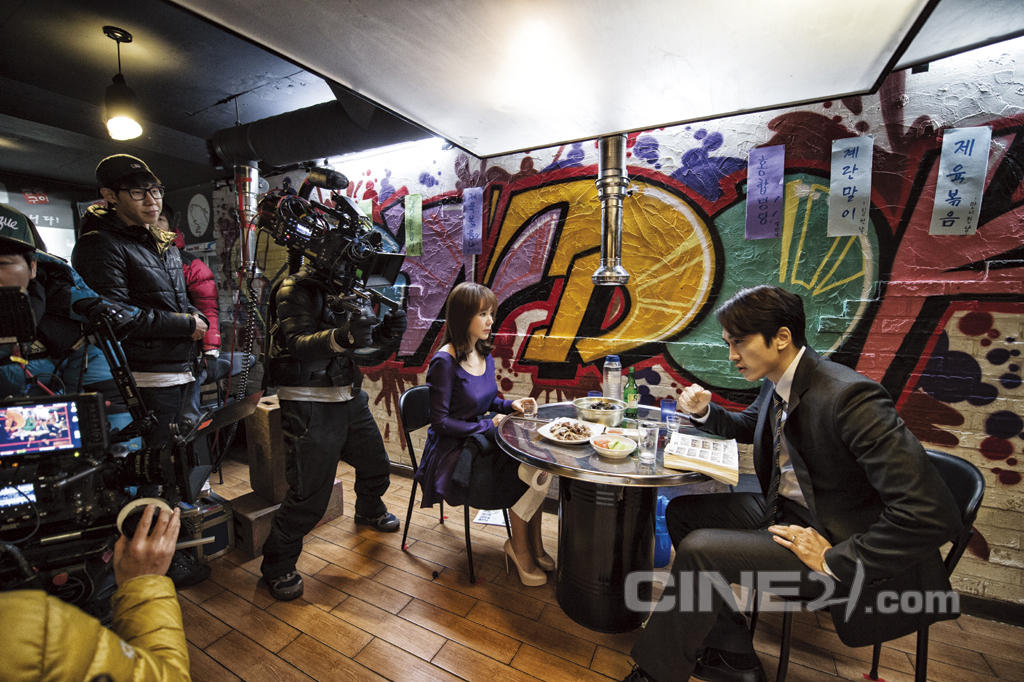 “감독님, 안 웃는 게 너무 힘들어요~!” “초반엔 가정파괴범”으로 등장하는 엄정화가 송승헌의 연기 앞에 진지한 리액션을 선보이고 있다. 이 장면의 비밀. “단계별로 계산된 디테일한 표정” 아래엔 추운 겨울밤의 촬영장을 견디게 하는 두툼한 담요와 따뜻한 커피가 숨어 있다.