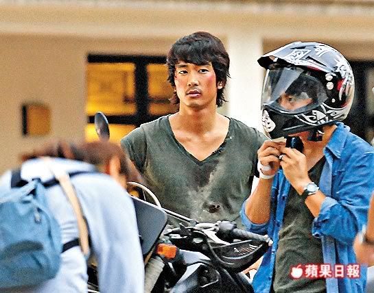 宋 承 憲 ( 中 ) 拍 攝 電 單 車 飛 馳 鏡 頭 , 由 他 身 旁 的 替 身 ( 右 ) 上 陣 。
