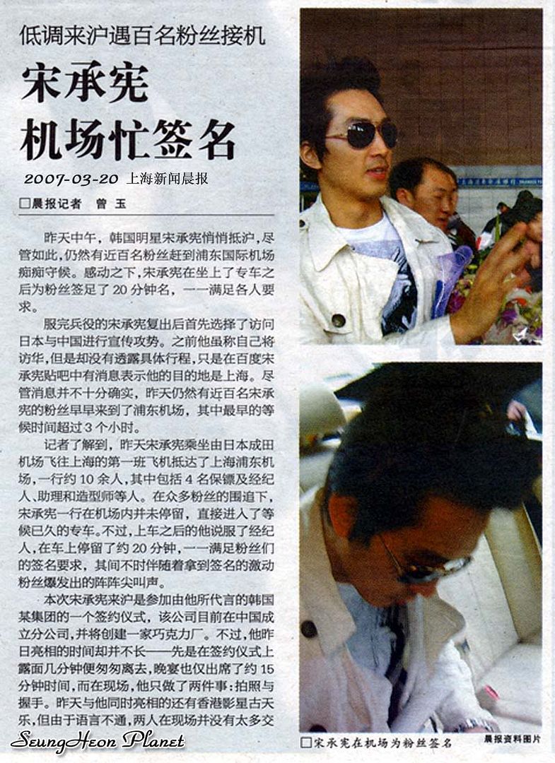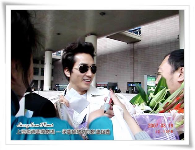好多的感恩dear all長久以來給予我滿滿的祝福,感恩在上海夢幻之旅中給予我很多幫助的dear all.正是擁有大家滿滿的祝福,帶著大家真誠的愛,我才會如此的幸運多多,幸福滿滿,讓我在短短的4個月裏可以6次見到承憲.真是好多好多的感恩.(真的是好巧喲,去年在韓國參加影迷會第三次見到承憲是2006年11月19日,這次在上海見到承憲是2007年3月19日,時間剛剛正好四個月整.更巧的是這次因為時間很趕,我都沒帶換洗的外衣褲,嘻嘻,我和承憲一樣都是穿牛仔褲配棕色休閒皮鞋吶.很多的巧合是吧).