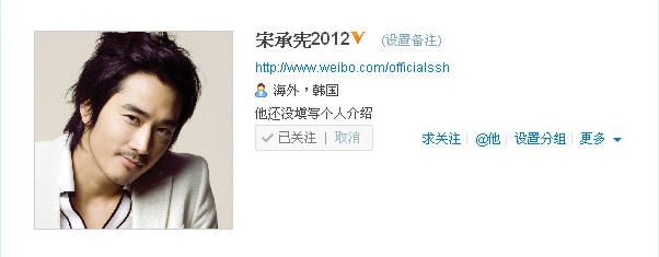 We had just received information from Beijing that Mr. Song Seung Heon (송승헌)'s Sina "新浪微博" will open at tomorrow 10:00AM. Please pay attenation to it.