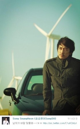 宋承宪近日在推特上留言道,“男人吹风的时候”,并上传了一张照片。照片中宋承宪身穿军绿色夹克,靠在汽车旁,望向远方。胡须配上略微凌乱的头发尽显男性粗犷的魅力。